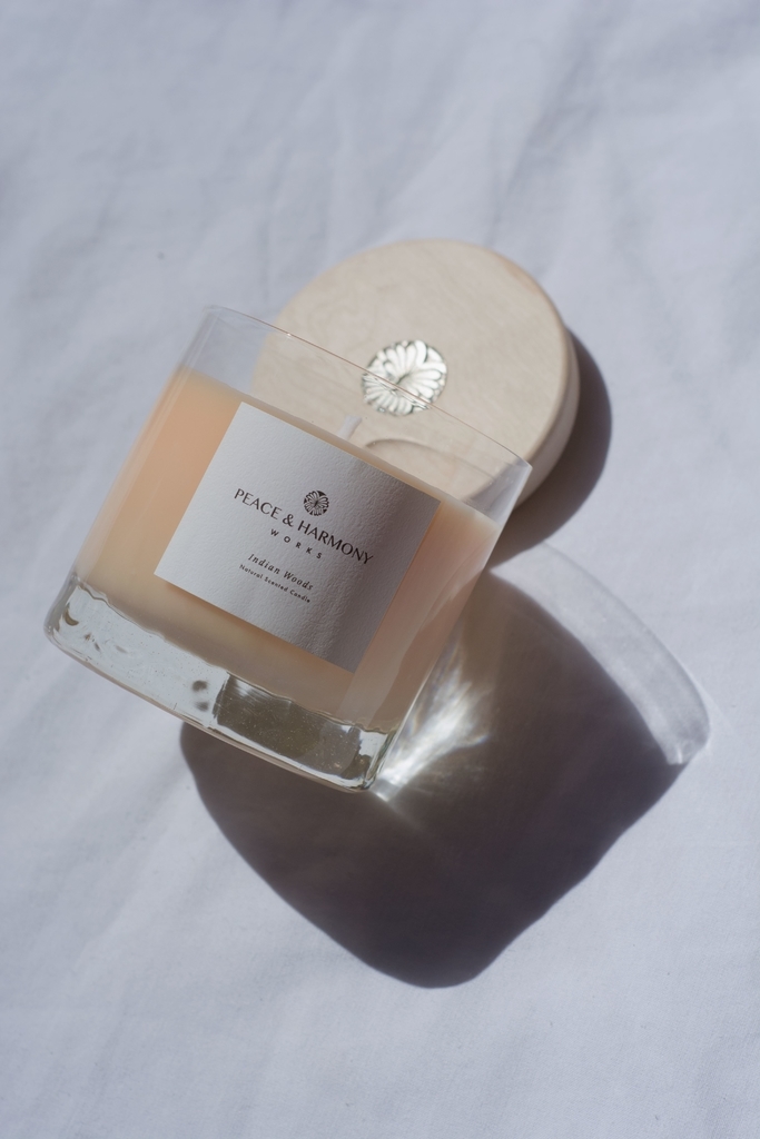 Envase de cristal soplado. Pura cera vegetal. Tapa de madera.